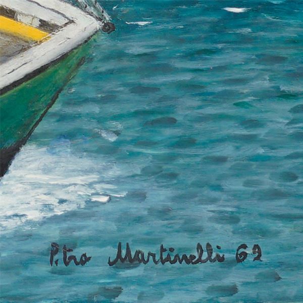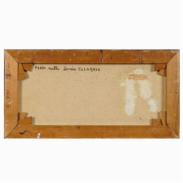 "Pesca nello Jonio - Calabria", 1969, olio su tela, firmato e datato in basso a destra, 30x60 cm.