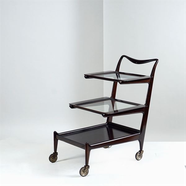 carrello portavivande con vassoi asportabili, legno tinto, mogano e vetro