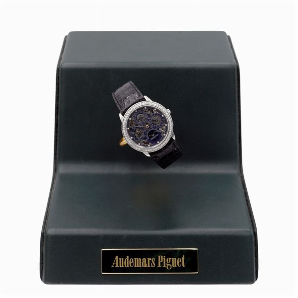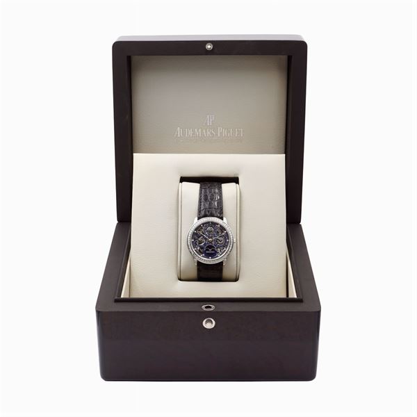 scheletrico in platino 950, ref. 25670PT/Z/0002, cassa tonda 36 mm. ref. 25670.002 - C97891.017, quadrante e fondello a vista, ghiera ed indici con diamanti taglio brillante ct 0,76, calendario perpetuo: quattro contatori ausiliari per giorno e numero della settimana, mese e fasi lunari, vetro zaffiro, movimento meccanico a carica automatica, calibro 21220/2, cinturino originale in pelle con fibbia in platino. Completo di scatola, garanzia ed espositore.