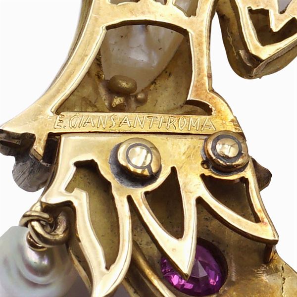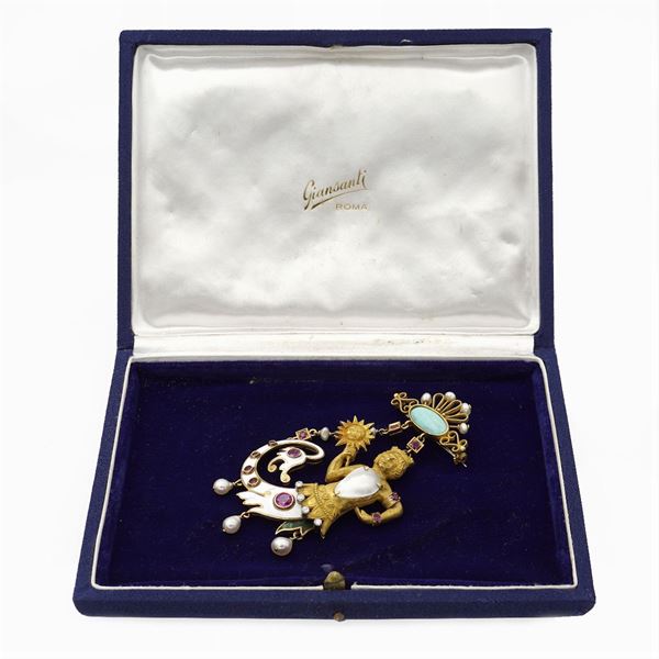 scolpita a raffigurare un tritone, impreziosita da rubini tondi, perle, diamanti taglio brillante, turchese taglio cabochon e stesura di smalto bianco, lievi difetti, firmata sul retro.