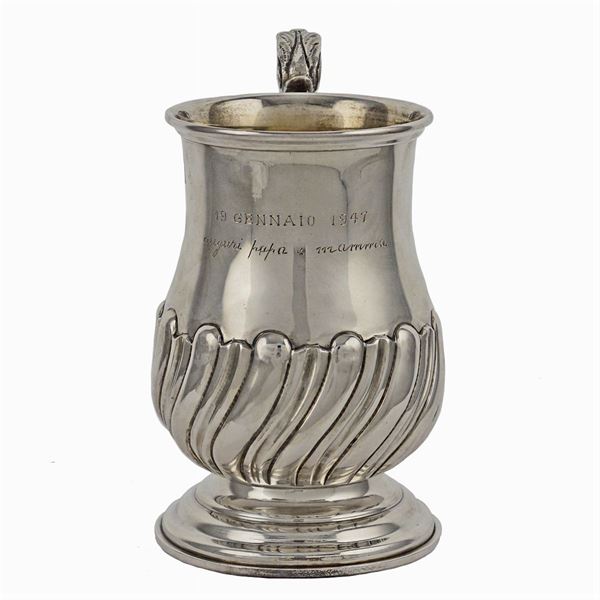 orafo Bruno Valabrega Roma, corpo sbalzato e cesellato con motivi floreali e di volute vegetali, manico sagomato, base liscia circolare, h. 12,5 cm., lievi difetti, peso 326 gr.