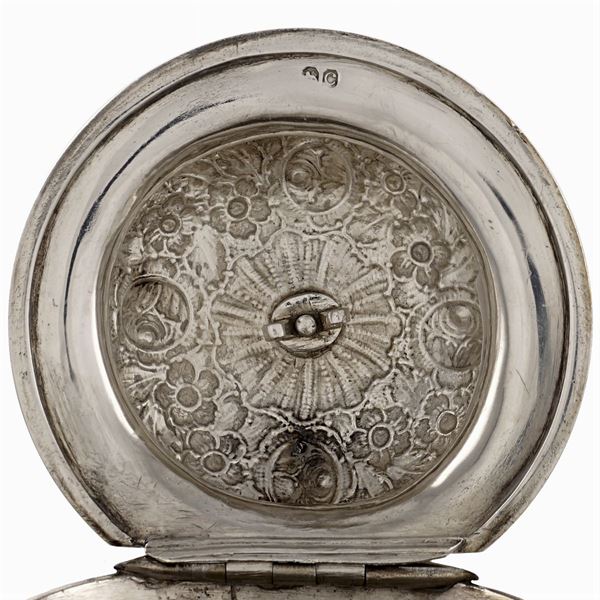 corpo piriforme sbalzato e cesellato con motivi floreali e vegetali, manico sagomato, presa del coperchio a foggia di pigna, h. 28 cm., peso 947 gr.