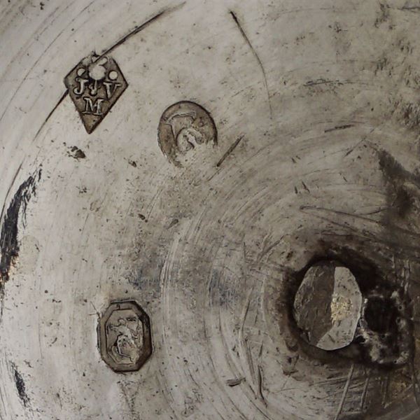 corpo piriforme, manico in legno, versatoio zoomorfo, coperchio con presa naturalistica, poggiante su tre piedini con terminale ferino, h. 31 cm., peso 870 gr.