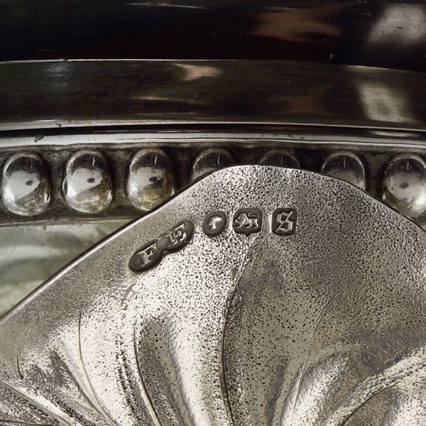 orafo Frederick Elkington, struttura circolare cesellata con profili perlinati, parte centrale con specchio a simulare un lago, con cigni, ninfee e una grande composizione vegetale, 50x42 cm.