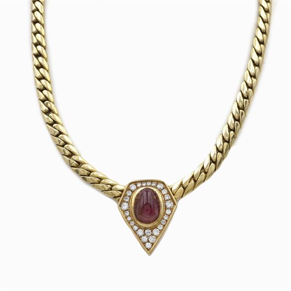 centrato da un rubino taglio cabochon ct 12,75 circa contornato da diamanti taglio brillante ct 1 circa, lunghezza 38 cm., peso 76,4 gr.
