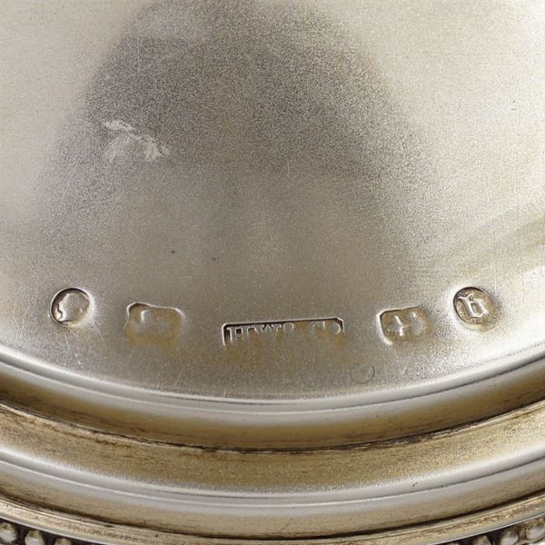 orafo Horace Woodward, corpi a tripode cesellati con motivi vegetali, floreali e geometrici, coppe in vetro parzialmente satinato (una restaurata), h. 28 cm.