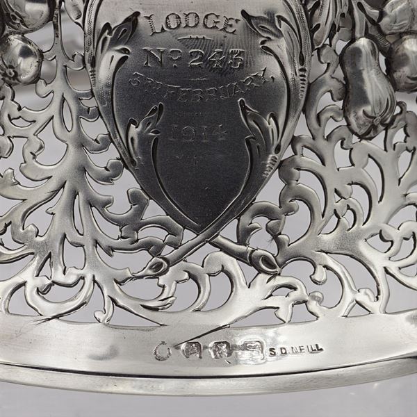 a) alzata circolare in argento, Irlanda XIX-XX sec., corpo traforato e cesellato con motivi naturalistici, 10x20 cm.