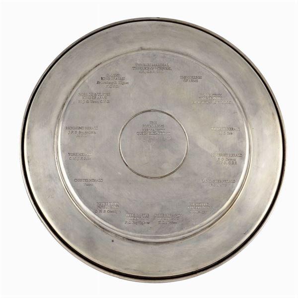 corpo liscio centrato da una placca tonda in argento vermeil raffigurante lo stemma reale del Regno Unito, d. 26,5 cm, peso 575 gr.