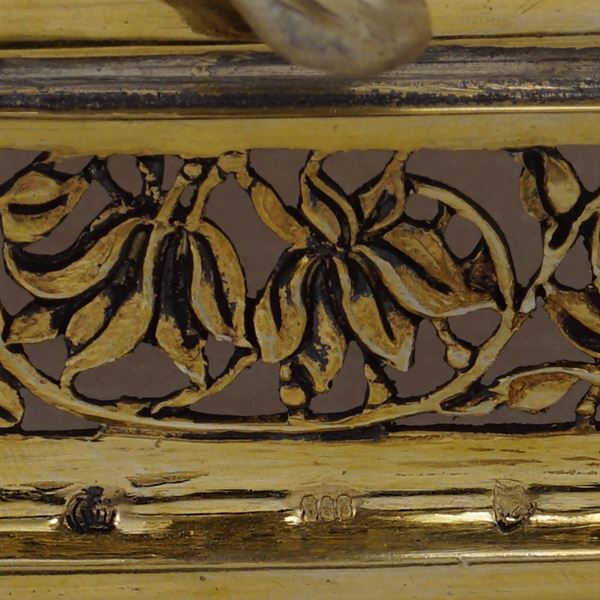raffigurante un cavaliere con lancia in tenuta da torneo su corsiero, base rettangolare traforata e cesellata con motivi vegetali, 33,5x37x12 cm., peso 1795 gr.