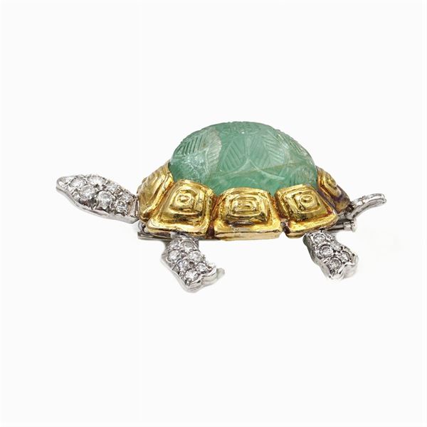 centrata da una radice di smeraldo incisa a motivo floreale lievi difetti, e diamanti taglio brillante ct 1,50 circa, peso 20,5 gr.