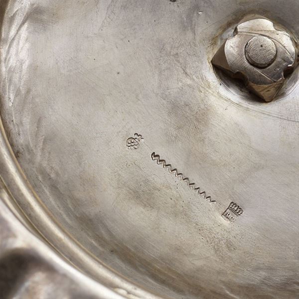corpo scolpito a raffigurare una scena di battaglia, base e coperchio in argento sbalzato, riuniti da un manico di linea sagomata, h. 25 cm.