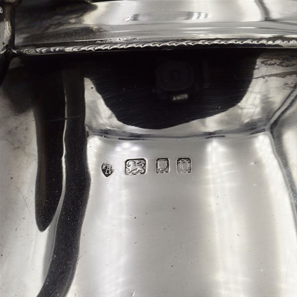 orafo Edward Barnard & Sons, corpo liscio con profilo baccellato, manico sagomato e presa del coperchio in legno, h. 13 cm., peso 431 gr.
