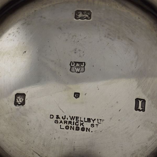orafo D&J Wellby, corpo liscio inciso con motivi vegetali e di volute, manico sagomato e presa del coperchio in legno, h. 19 cm. , peso 773 gr.