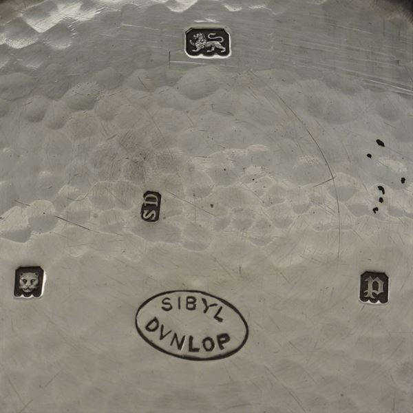 orafo Sybil Dunlop, corpo liscio martellato, manico e sagomato e presa del coperchio in legno, h. 17 cm., peso 468 gr.