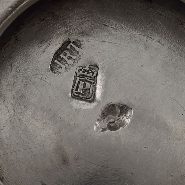 corpo piriforme, sbalzato e cesellato con motivi floreali, presa del coperchio a foggia di cane, manico di linea sagomata, h. 20,5 cm., 528 gr.