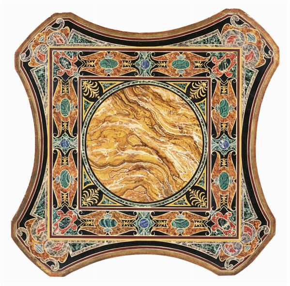 piano sagomato in scagliola decorata a simulare commesse di marmi policromi, sorretto da quattro elementi in legno intagliato con motivi di putti alati ed un elemento centrale a colonna, base godronata con riserve ed elementi vegetali