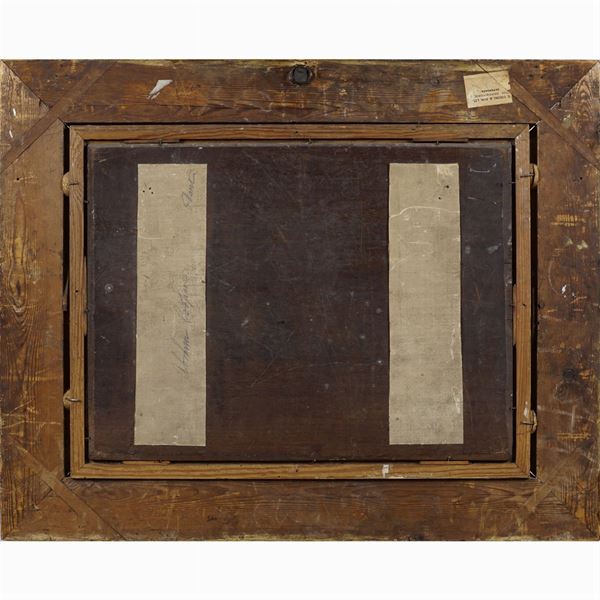"Scena di battaglia", olio su tavola, entro cornice in legno dorato, 38x50 cm.