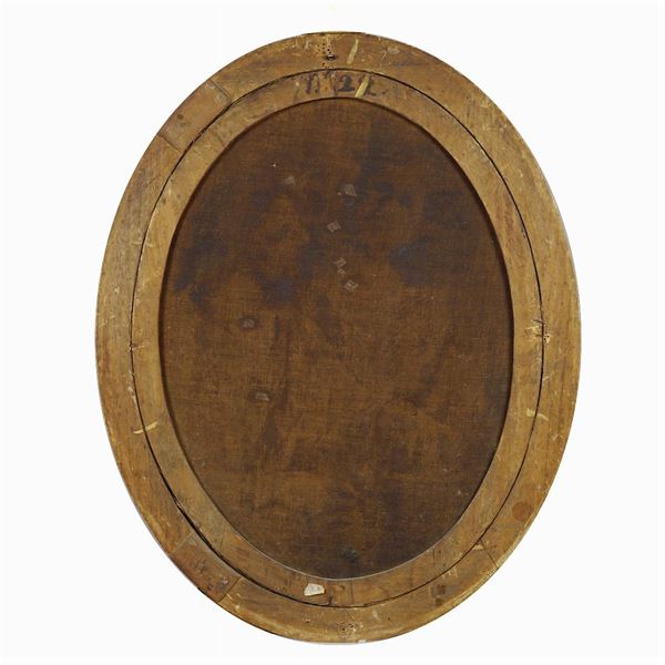 "Allegoria delle virtù", olio su tela ovale , difetti alla tela, 97x72 cm.