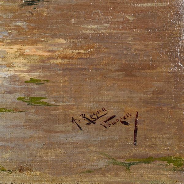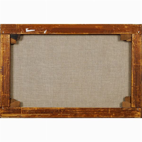 "Lo Squero di San Trovaso - Venezia", olio su tela, firmato in basso a destra, entro cornice in legno dorato