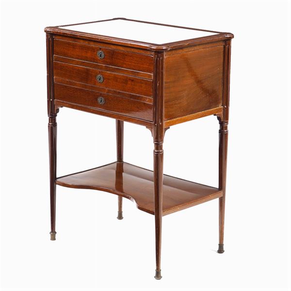 fronte a tre cassetti, gambe tornite riunite in basso da un ripiano, piano in marmo bianco, lievi difetti, 70x50x35 cm.