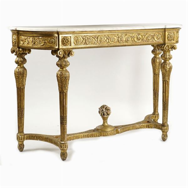 corpo intagliato con ricche volute vegetali ed elementi floreali, poggiante su quattro gambe con analogo decoro riunite al centro da crociera, piano sagomato in marmo bianco, lievi difetti ed usure, 94x141x48 cm.