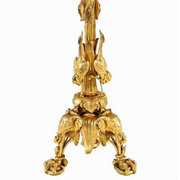 corpi cesellati e decorati con motivi di vegetali e gru, bracci di linea sagomata, base decorata con teste di elefanti e serpenti sovrapposti, terminali a zampe di rapace, 69x32 cm.