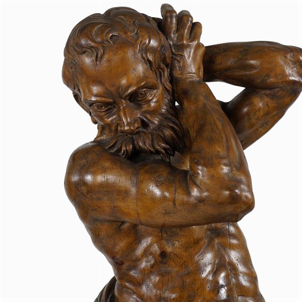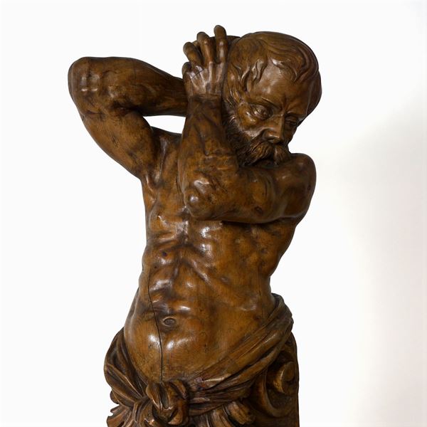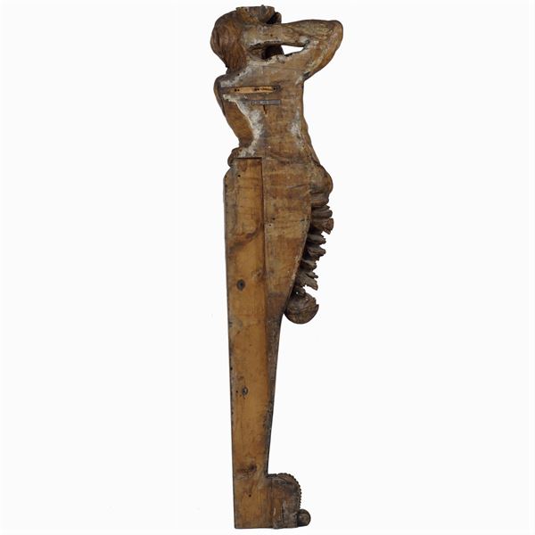 scolpiti ed intagliati a raffigurare due figure maschili, terminali a voluta con elementi vegetali, lievi difetti, 190x50 cm.