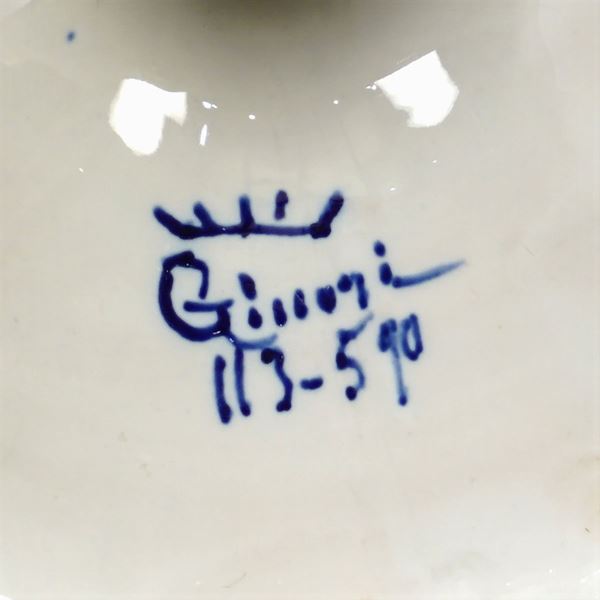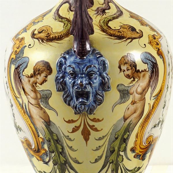 corpo ovoidale decorato in policromia con motivi di grotteche, anse a volute con mascheroni, marchio Ginori n° 113/590 sotto le basi, h. 40 cm.