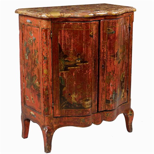 decorata in oro con scene di genere, fronte a due sportelli, fianchi decorati con motivi floreali e vegetali, piano in breccia di Aleppo, usure, 95x78x48 cm.