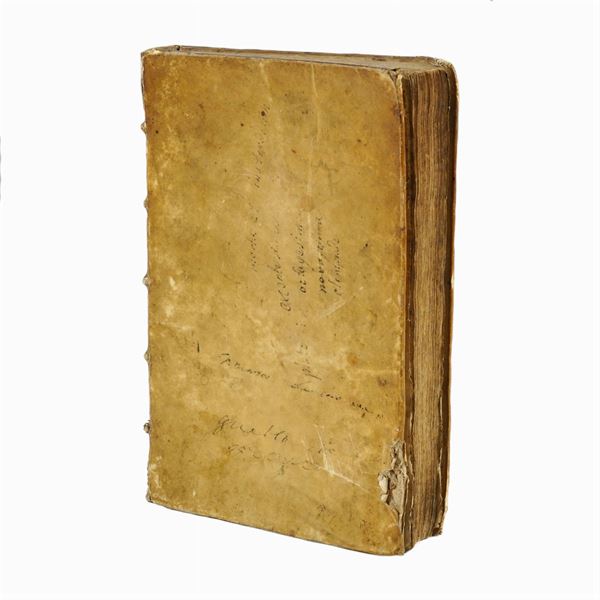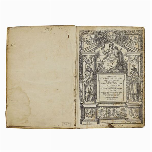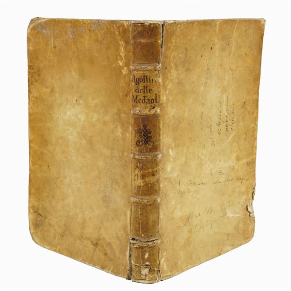 prima edizione italiana di Guglielmo Faciotto, importante trattato di numismatica suddiviso in dialoghi tra l'autore e due ipotetici interlocutori. I dialoghi descrivono le medaglie e quali tra di esse sono monete, in particolare quelle che raffigurano virtù e Dei, provincie, città e fiumi., 33x22 cm.