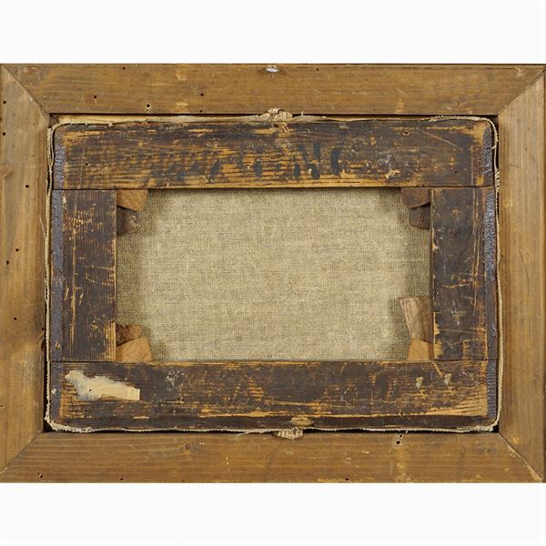 "Architettura con figure", olio su tela, entro cornice in legno dorato, 21x31 cm.