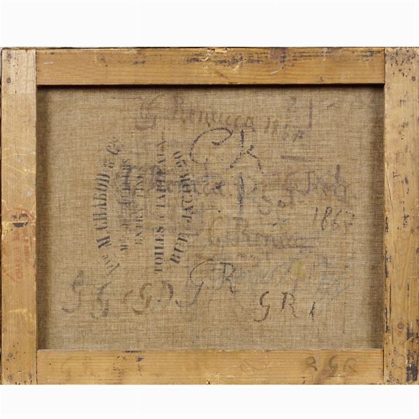 "La guarigione dello storpio", bozzetto su tela, tracce di firma in basso a destra, varie sigle e firme sul retro con data 1867, 33x41 cm.