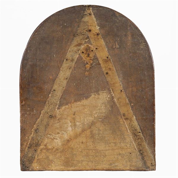 con quattro santi in basso, tempera su tavola, difetti, 46x37 cm.
