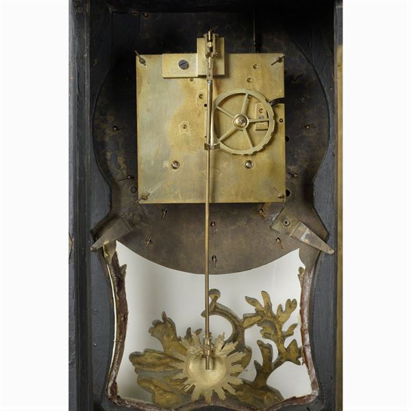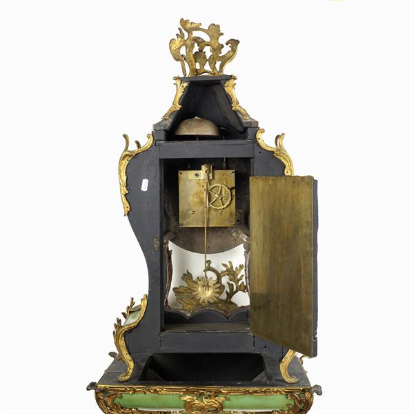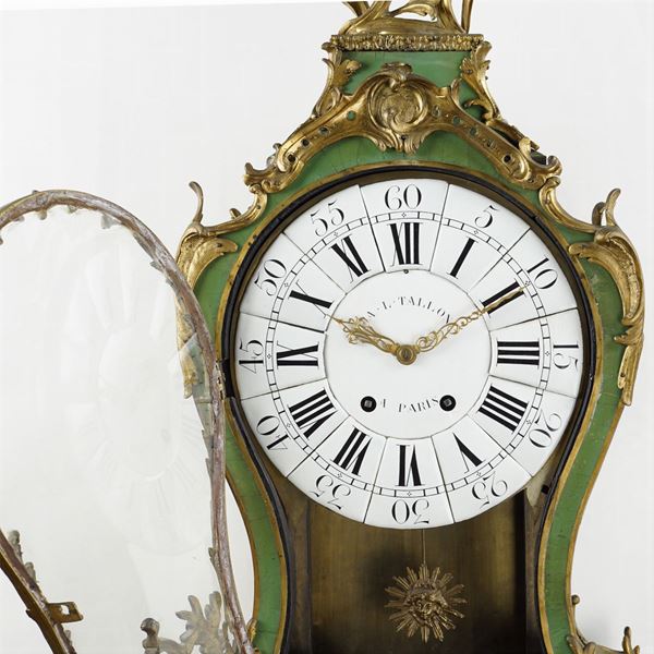 orologio Cartel Luigi XV, cassa e mensola in legno, rivestito in corno verde con stampigliatura a fuoco sulla cassa in alto, ricche applicazioni in bronzo dorato e cesellato con volute vegetali, elementi floreali e motivi di volatili, mensola con quadrante smaltato con numeri romani firmato A.L. Tallon a Paris, meccanica del XIX secolo firmata Roblin & Fils Freres, Paris
