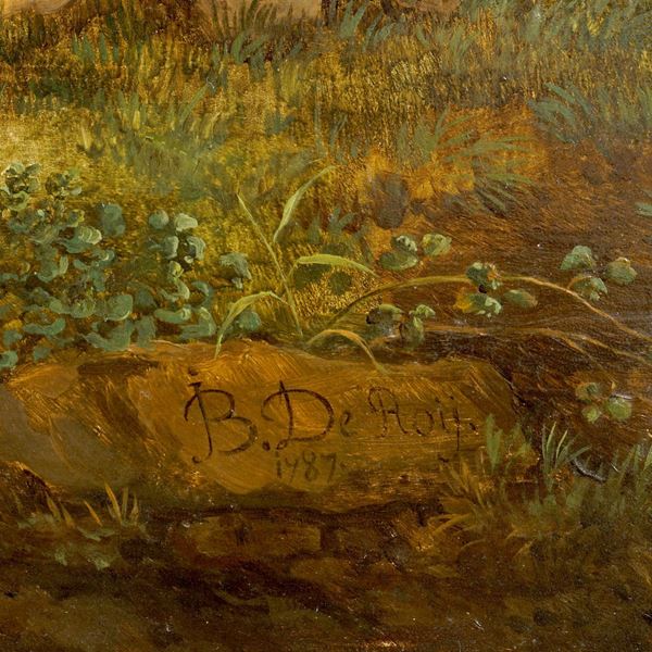 "Paesaggio con armenti e famiglia di pastori", 1787, olio su tavola, firmato e datato in basso a destra, entro cornice, 60x77 cm.