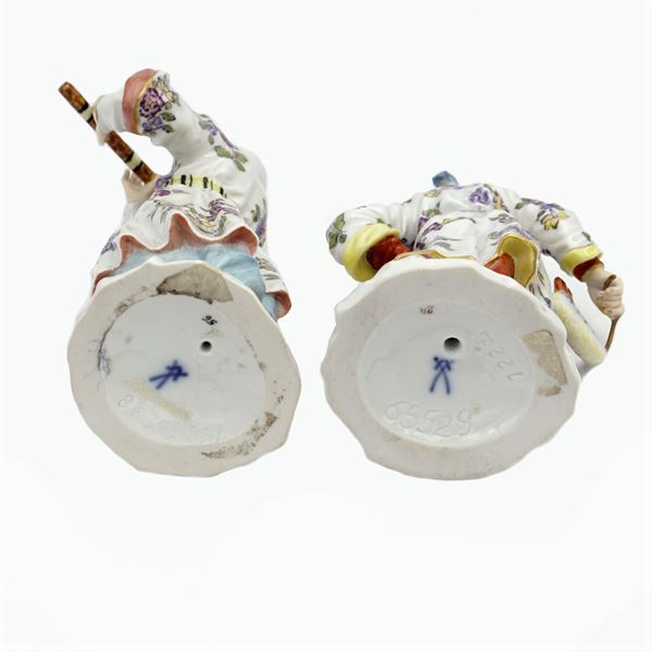 raffiguranti giapponesine su basi fiorite, marchi sotto le basi, h. 13,5 cm.