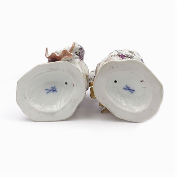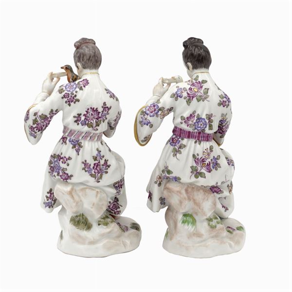 raffiguranti giapponesine sedute con uccellini, basi fiorite, marchi sotto le basi, h. 12,5 cm.