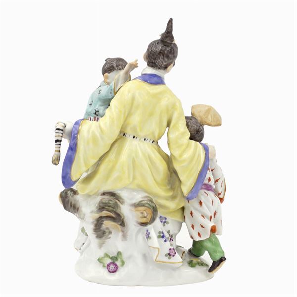 raffigurante un donna giapponese con due bambini, modello n. 65649, marchio sotto la base, h. 14,5 cm.