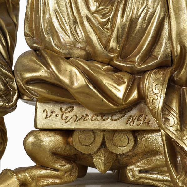 struttura architettonica decorata con inserti in lapislazzulo e filettature in bronzo, sormontata da una figura femminile in bronzo dorato, meccanismo Bordier Paris, quadrante circolare con indici romani in bronzo dorato, firmato e datato sulla base, 49x48x29 cm.