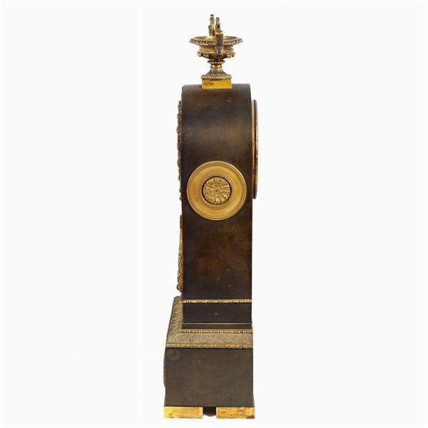 struttura architettonica decorata con applicazioni floreali e vegetali in bronzo dorato, quadrante circolare con numeri romani in porcellana, difetti e mancanze, 55x25x12,5 cm.