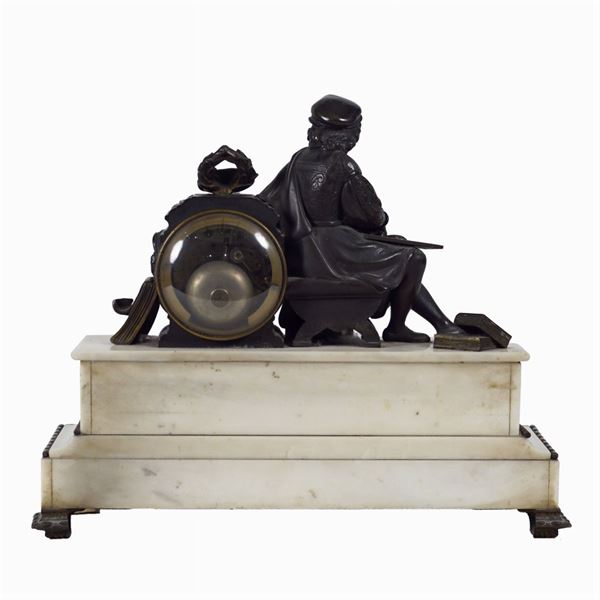 struttura architettonica in marmo sormontata da una figura raffigurante l'Allegoria della pittura in bronzo brunito, quadrante circolare con numeri romani, 36x42x15,5 cm.