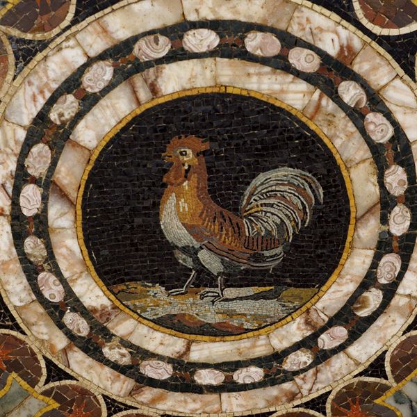 decorato a mosaico con motivi geometrici e di volute, al centro è raffigurato un gallo entro riserva circolare, entro cornice in legno ebanizzato, 70x70 cm.