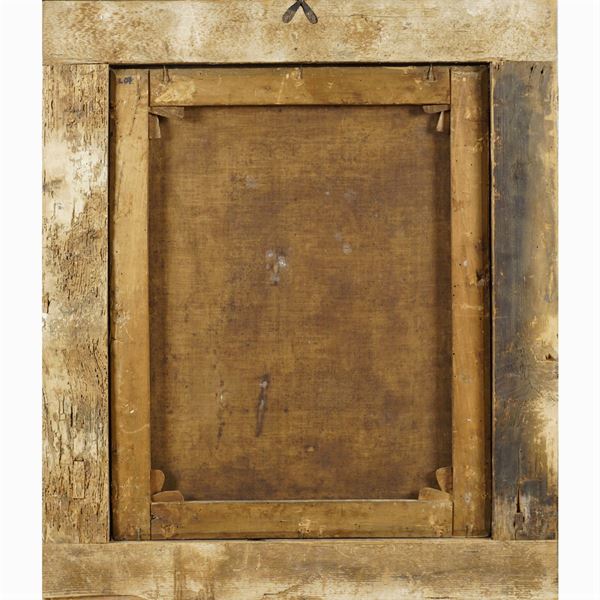 "San Giuseppe con il Bambino Gesù entro ghirlanda di fiori", olio su tela, entro cornice in legno dorato, 74x58 cm.