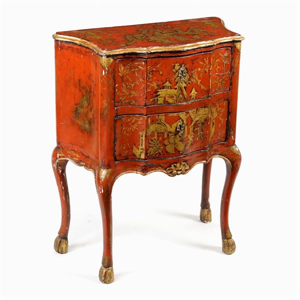 decorato e dorato con motivi di chinoiserie, piano sagomato con due cassetti sottostanti, difetti e sostituzioni, 88x70x36 cm.
