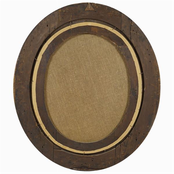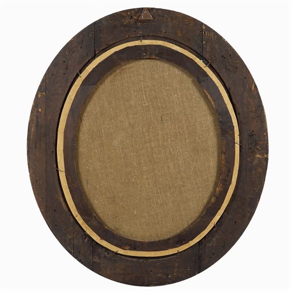 "Ritratto di gentildonna e gentiluomo", coppia di oli su tela ovale, entro cornici in legno dorato, lievi cadute di colore, 75x64 cm.