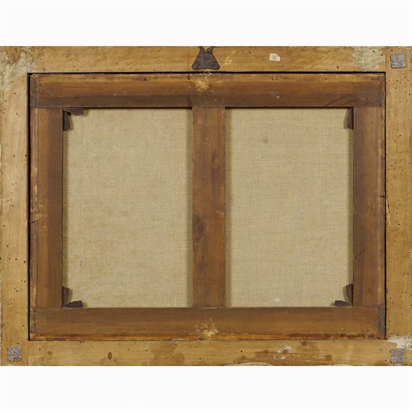 "Marina con figure", olio su tela, entro cornice in legno dorato, 40x61 cm.