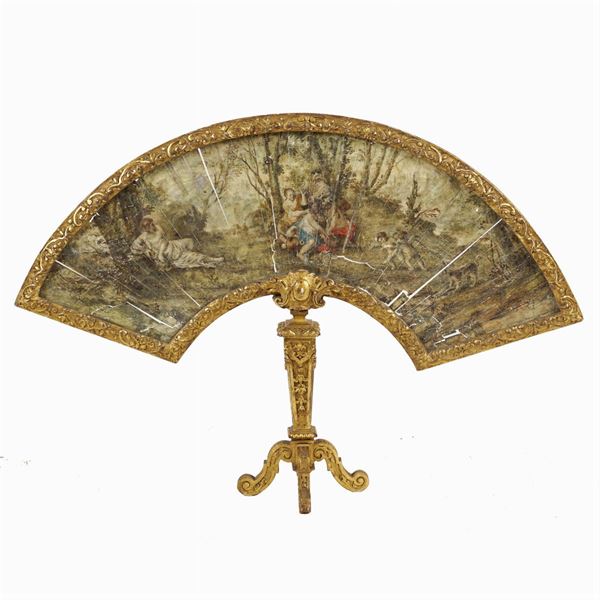 "Rituale sacrificale dedicato alla Dea Vesta- Scena di baccanale", ventaglio dipinto ad olio su carta, entro teca in legno dorato, 36x52x14 cm.