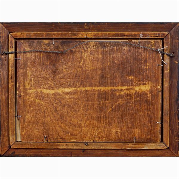 "Veduta del Colosseo con figure", acquarello su tempera, entro cornice, 17x25 cm.