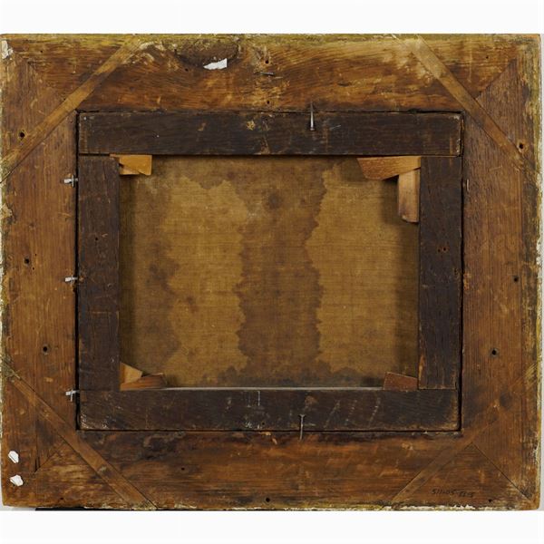 "Scorcio di paesaggio con figure", olio su tela, entro cornice in legno dorato, 29x34 cm.