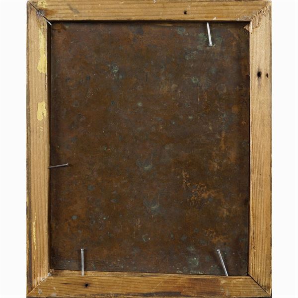 "San Francesco in adorazione", olio su rame, entro cornice, 18,3x14,4 cm.